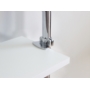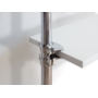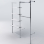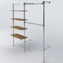 Wandaufhängung aus Stahlrohr mit 25 mm Durchmesser und Verbindungselementen. Alle Stahlelemente sind verchromt. Einlegeböden aus 18 mm starken Möbelplatten, PVC-Kanten.